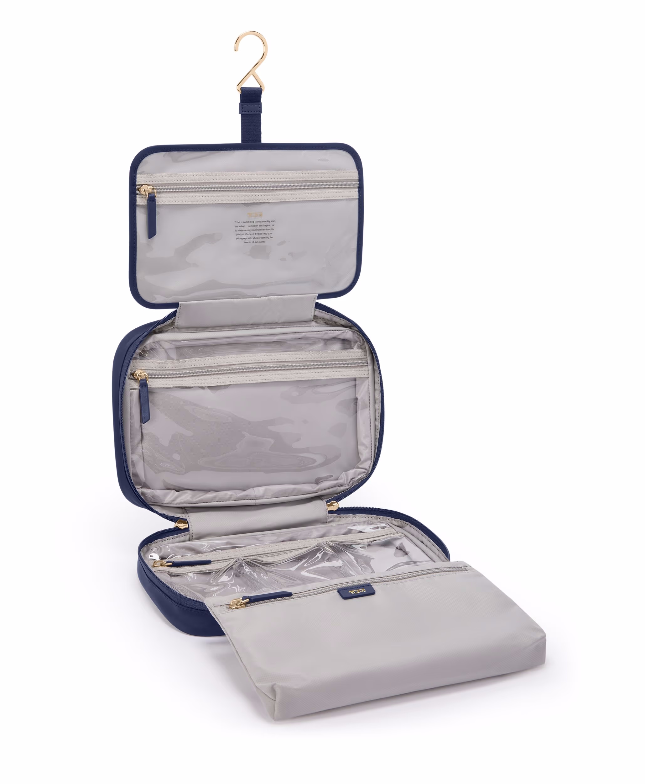 TUMI Madeline — функциональная косметичка из коллекции Voyageur, созданная для удобной организации дорожных аксессуаров. Три прозрачных отделения и съёмный чехол обеспечивают идеальный порядок, а крюк для подвешивания позволяет использовать её в открытом виде дома или в путешествии.